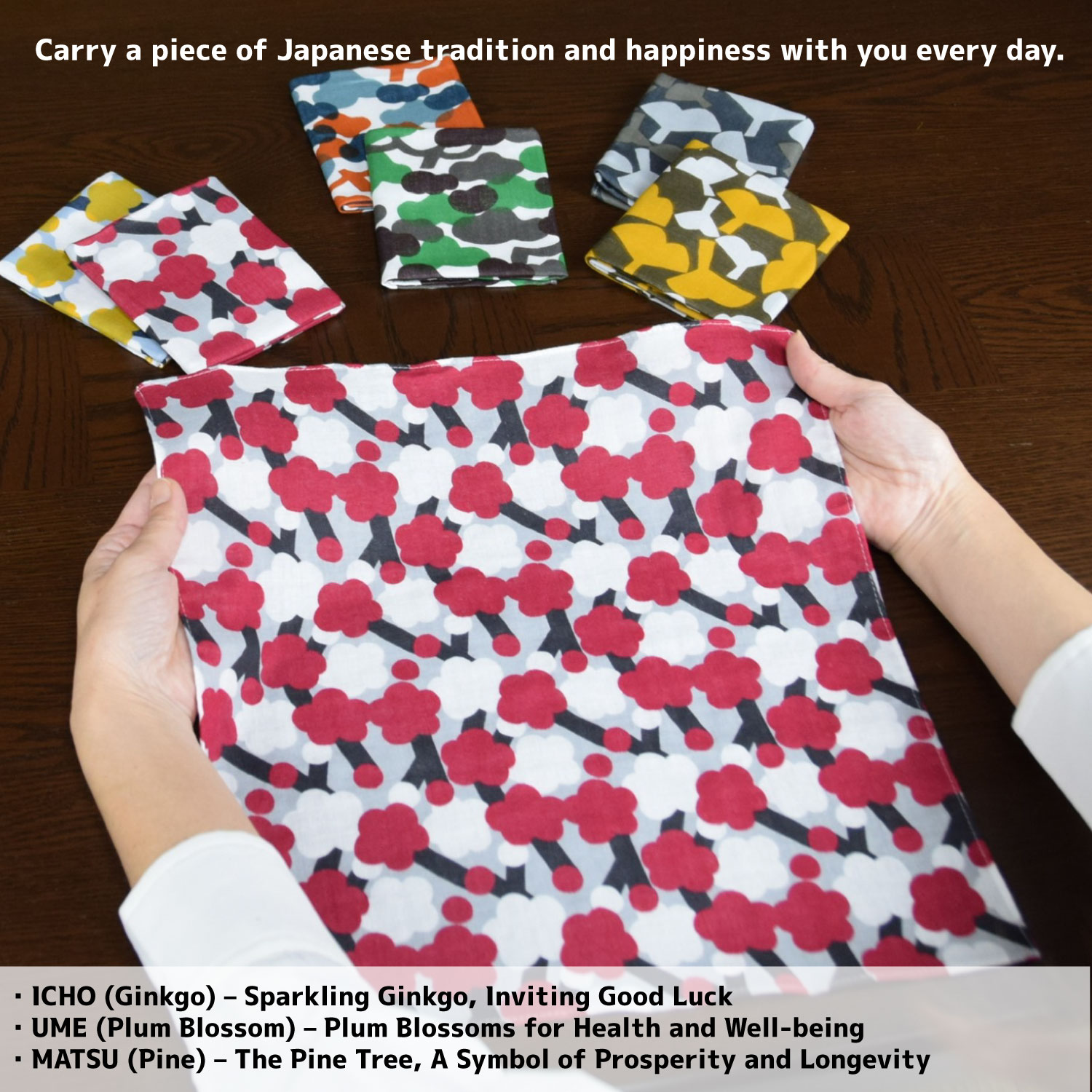 ・銀杏文様(銀杏の煌めき、幸運を呼ぶ)・市松文様(粋な市松、伝統の美)・梅文様(無病息災の梅)・青海波文様(無限の波は豊かさの象徴)・南天文様(魔除けの南天)・松文様(松は繁栄のシンボル)