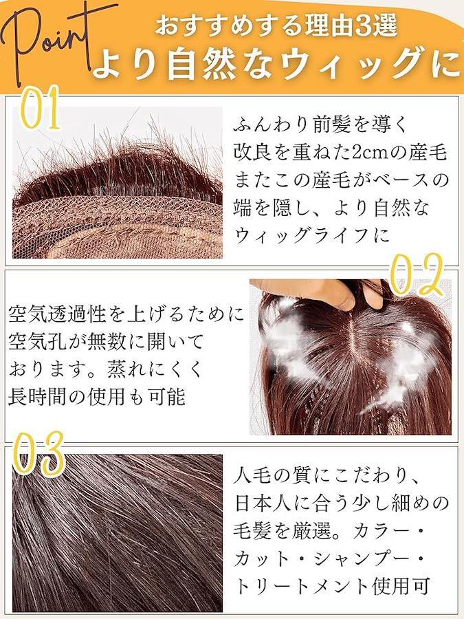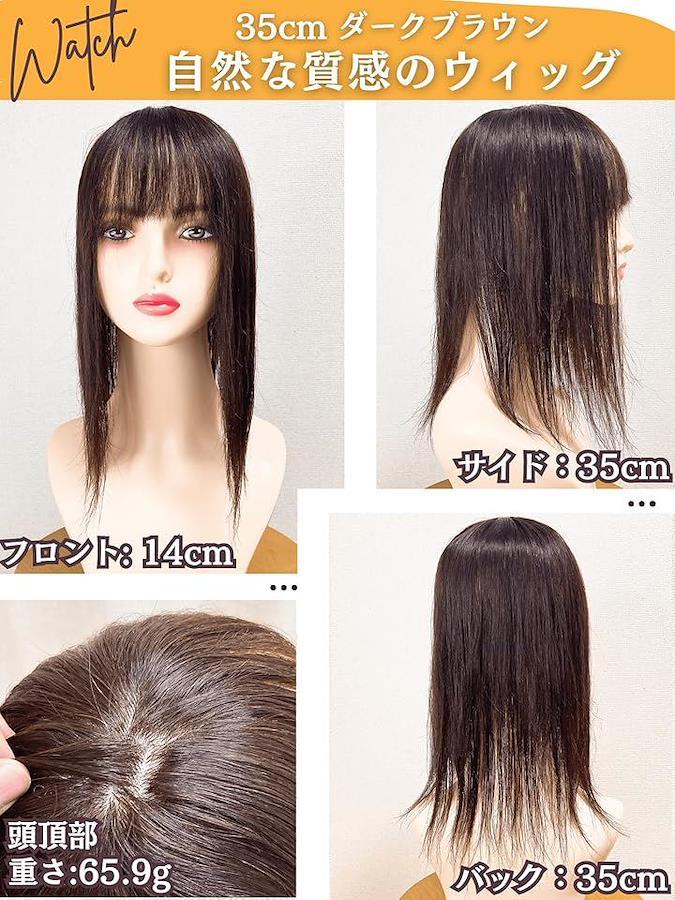 高級人毛100%の為、ヘアアイロン、ヘアカット、シャンプー、ドライヤー、ヘアカラーも使用可「商品詳細」 (3)サイズ:ストレートセミロング フロント14cm トップ 24cm バック 35cm、サイド 35cm (4)重さ:約 65.9g (5)カラー:ダークブラウン (6)対象: レディース 女性 医療用 プレゼント 中高年 (7)用途: うぃっぐ ウィッグ かつら 部分ウィッグ「空気透過性UP」(8)ベース: 強力固定ピンは3つで、より自然なつけ心地を再現致しました。