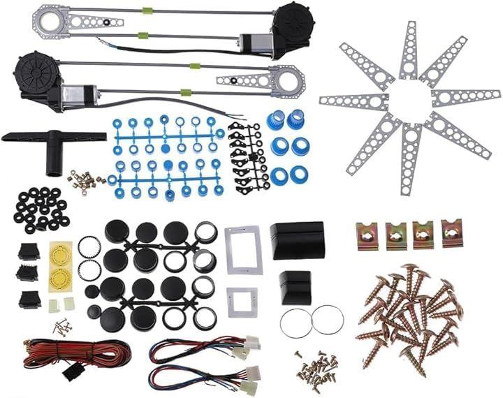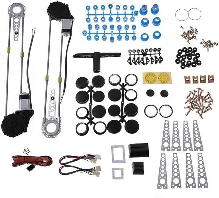 パワーウィンドウコントロールスイッチ、レギュレーターモーター、各ギア、ステー、カバー、ステー、助手席用パワーウィンドウスイッチなどが付属。