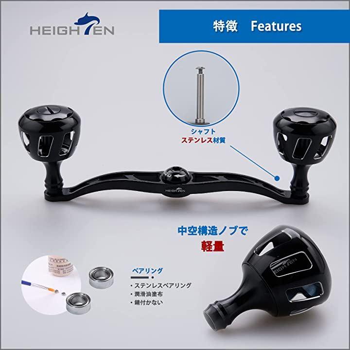 HEIGHTENリールハンドル高精度CNCマシンカット加工高品質70シリーズアルミニウム素材で軽く、強く仕上がっているダイワ(Daiwa)、シマノ(Shimano)、アブかルシア(AbuGarcia)に取り付けが可能人体工学と滑り止め設計でグリップ感が体感できる、質感も良くハンドル部のステンレス材質ベアリングも精度良く回転、手にフィットするノブに変えることで、コントロール性能が上がり、一日中巻いても疲れない。