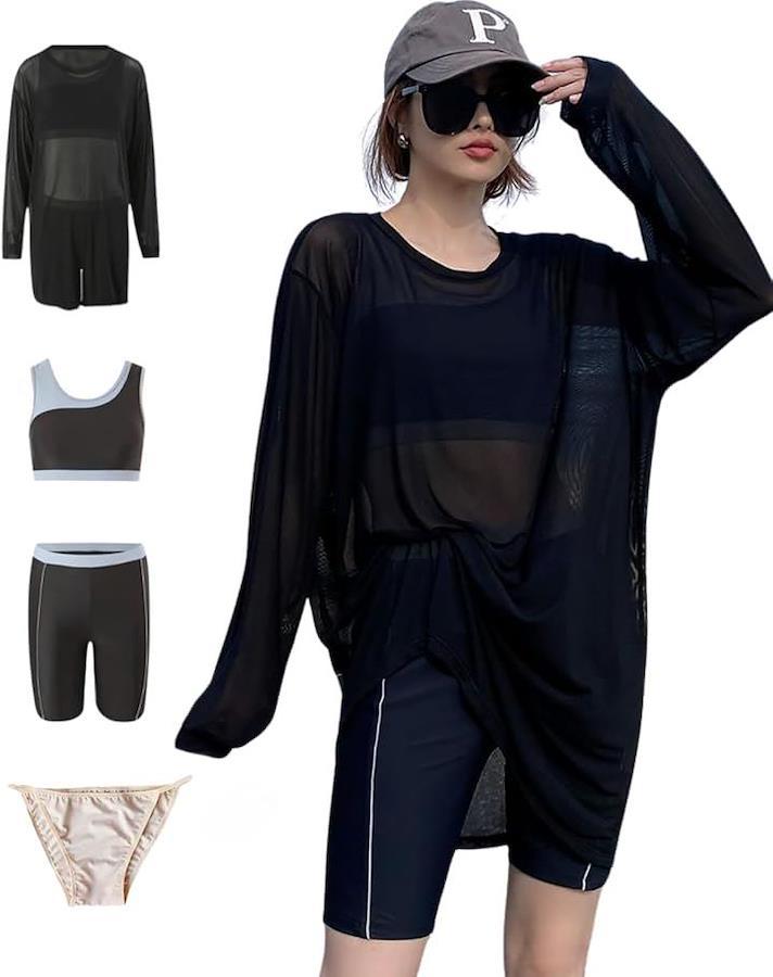 スポーツブラ+ショートパンツ+ロングカバーアップに加え、安心のアンダーショーツ付きで透け防止もバッチリ。