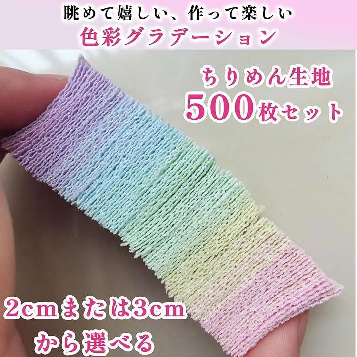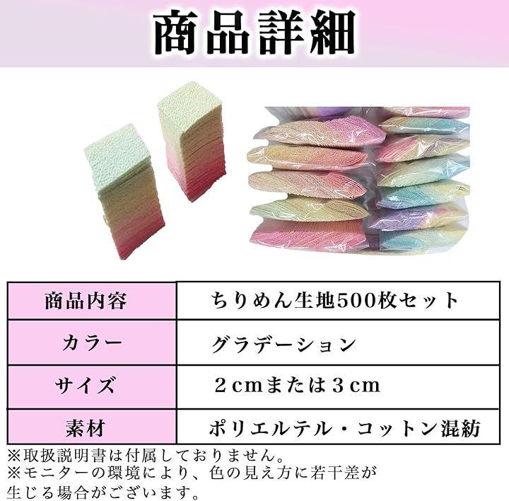 「商品内容」ちりめん生地500枚セット「カラー」 グラデーション「サイズ」2cmまたは3cm「素材」 ポリエステル・コットン混紡*モニターの環境により、色の見え方に若干差が生じる場合がございます。
