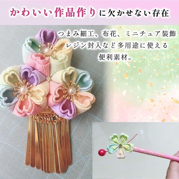 「ハンドメイド・クラフトに広がる使い道」つまみ細工、布花、ミニチュア装飾、レジン封入など多用途に使える便利素材。