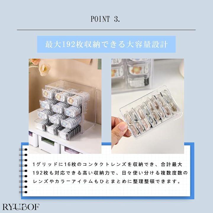 「最大192枚収納できる大容量設計」 1グリッドに16枚のコンタクトレンズを収納でき、合計最大192枚も対応できる高い収納力で、日々使い分ける複数度数のレンズやカラーアイテムもひとまとめに整理整頓できます。