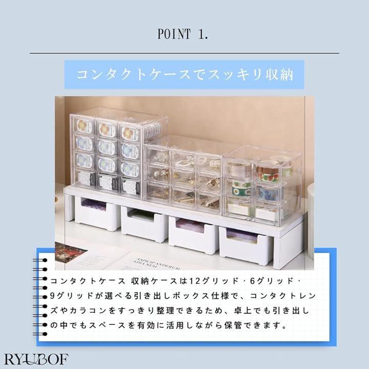 「コンタクトケースでスッキリ収納」 コンタクトケース 収納ケースは12グリッド・6グリッド・9グリッドが選べる引き出しボックス仕様で、コンタクトレンズやカラコンをすっきり整理できるため、卓上でも引き出しの中でもスペースを有効に活用しながら保管できます。
