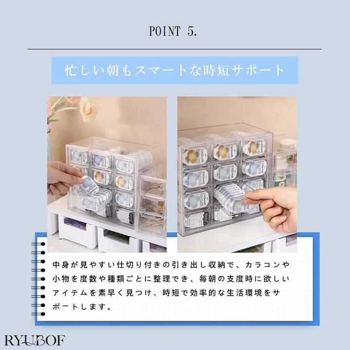 「忙しい朝もスマートな時短サポート」 中身が見やすい仕切り付きの引き出し収納で、カラコンや小物を度数や種類ごとに整理でき、毎朝の支度時に欲しいアイテムを素早く見つけ、時短で効率的な生活環境をサポートします。