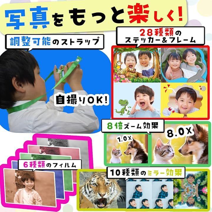 タイマーや自撮り機能、音楽・ゲーム機能も搭載し、3歳~7歳の幅広い年齢に対応。