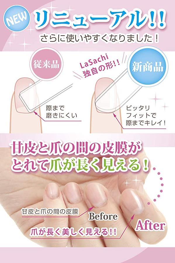 ・「進化した爪磨き」日本発の先端レーザー加工技術によって実現した 0.01μ の粒子が、爪表面の 凸凹 を無くし、同時に出てくる細かい削りカスが研磨剤となって爪を ツヤツヤ にしてくれます。