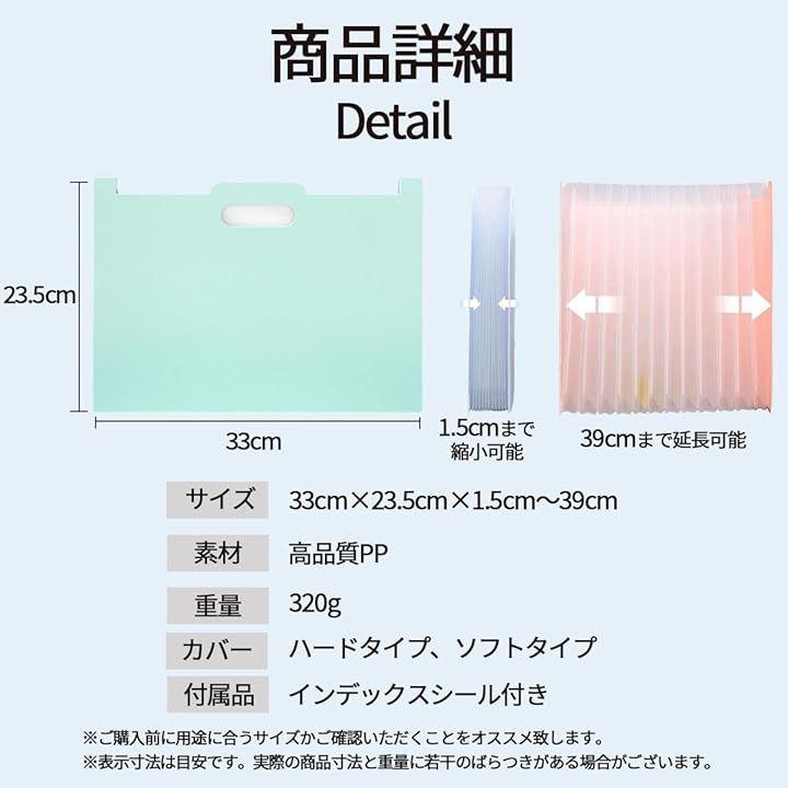 「サイズ」H235xW330xD15~390mm「カバーの固さ」ハードカバー、ソフトカバー「カラー」ブラック、ネイビー、グリーン、ライトブルー、ピンク、オフホワイト、ピスタチオ、スカイブルー、サクラ、クリーム
