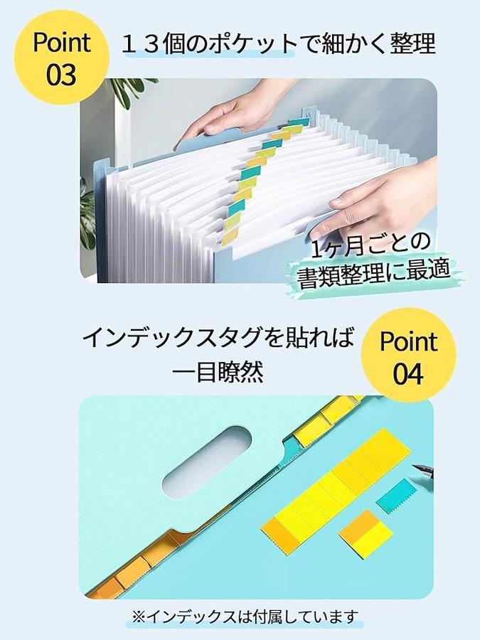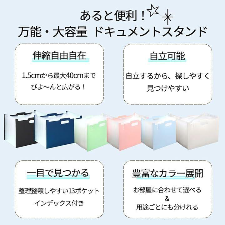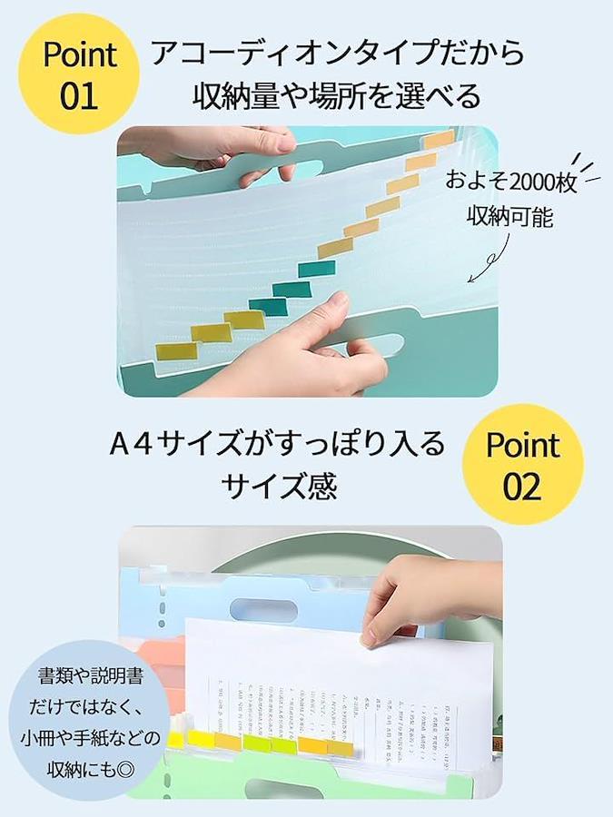 「書類整理ファイルで生まれる探し物ゼロ生活」蛇腹の広がりで一覧性が高く、ぱっと開けば全ポケットが見渡せる書類整理ファイル。