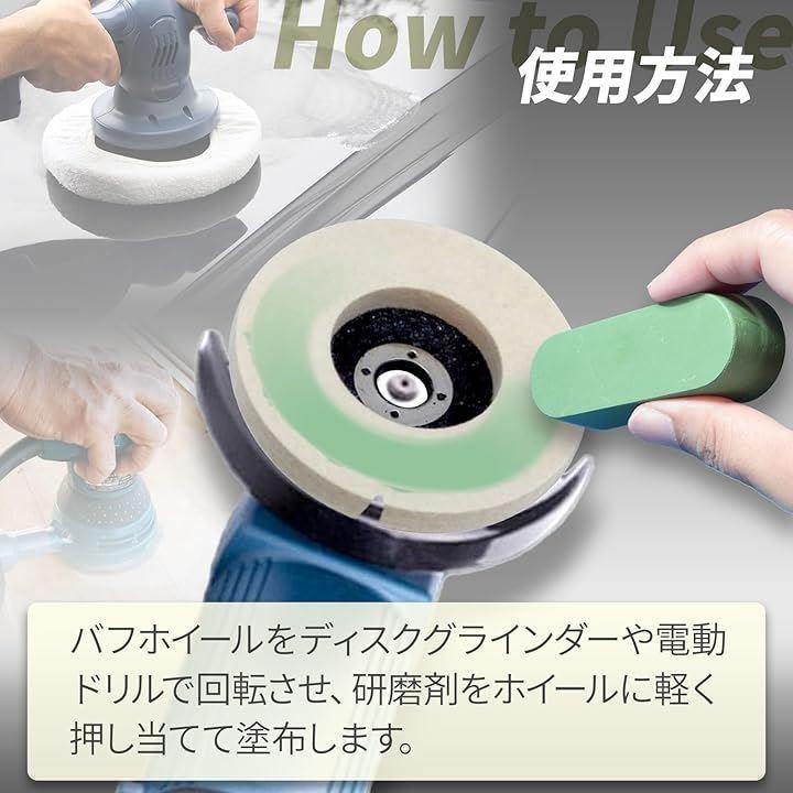 「電動機器で手軽に表面仕上げ」ディスクグラインダーや電動ドリルのバフに研磨剤を付着させて使用するだけで、簡単に愛車のアルミホイール磨き剤としても活用できます