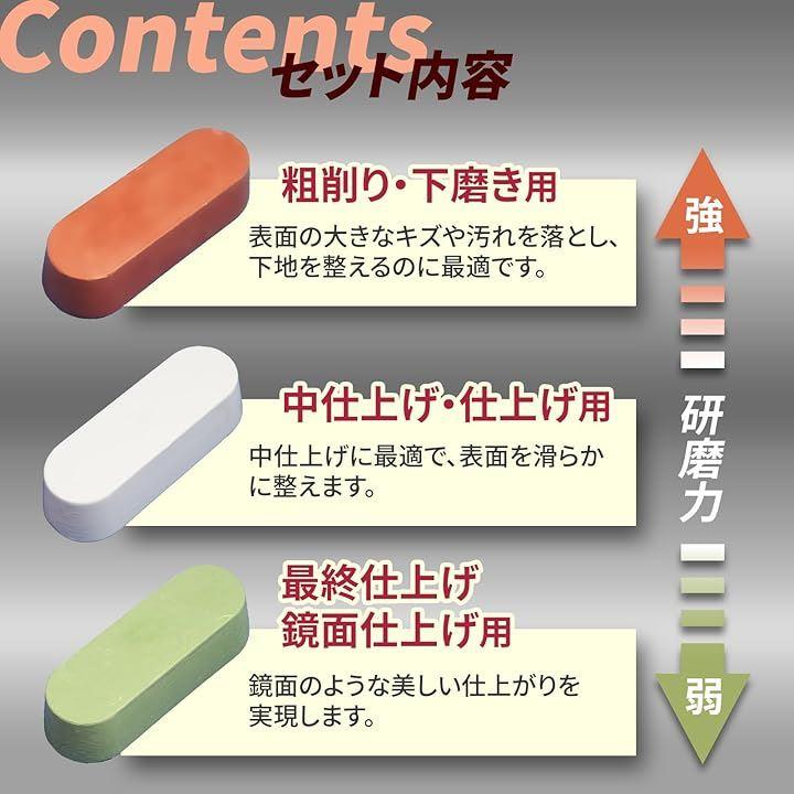 「研磨剤3本セット」研磨力の異なる赤棒・白棒・青棒がセットになった研磨剤で、粗削りから 研磨剤 鏡面仕上げ まで幅広い仕上げが可能です。