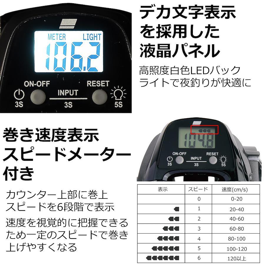 タイラバ特化型DLC、一日中使っていても疲れないアンダー200gの軽量設計!液晶画面上部には巻上スピードが6段階で表示される仕組みになっており、速度を視覚的に把握することでその日の当たりパターンをいち早く察知。ハンドルは4mm厚のカーボン製で120mmのロング仕様。カーボンマトリックス+ドラグクリッカー搭載でスムーズかつエキサイティングなファイトを実現。9+1ボールベアリング搭載。釣り場で実際使うカウンター操作は、超簡単!左ボタン:電源ON OFF/ 右ボタン:RESET(0mセット)及びライト点灯のみ!電池はアングラーがその場で簡単に交換することが可能。電池型番CR2032。電池残量が少なくなった際の交換目安表示付き。※本機種にはあらかじめPE1.5号200m(4本撚り糸)のデータが入力されている。