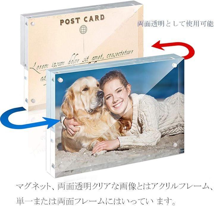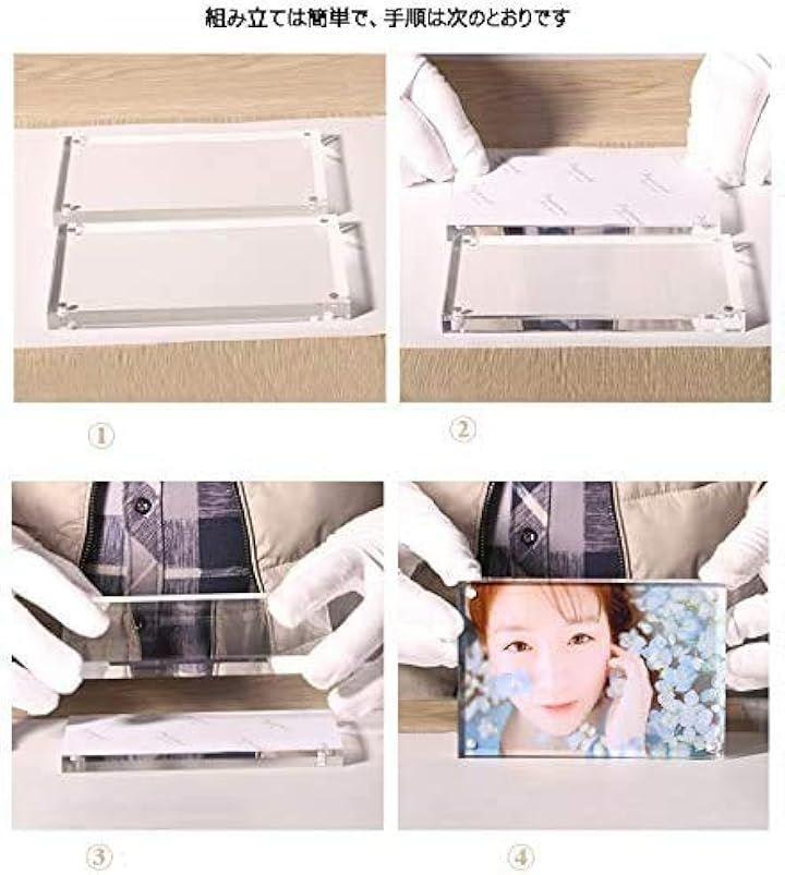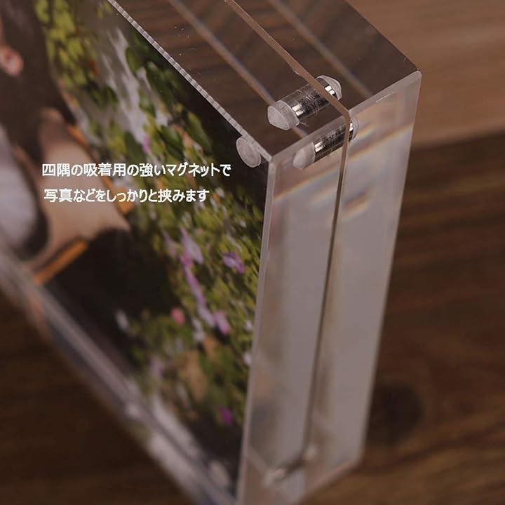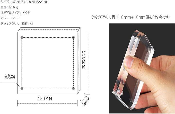 「重厚感のアクリル板・強力な磁石式」2枚のアクリル板(10mm+10mm厚の2枚合わせ)の間に、四隅の吸着用の強いマグネットで挟んで固定する為、写真の差し替えが簡単です。