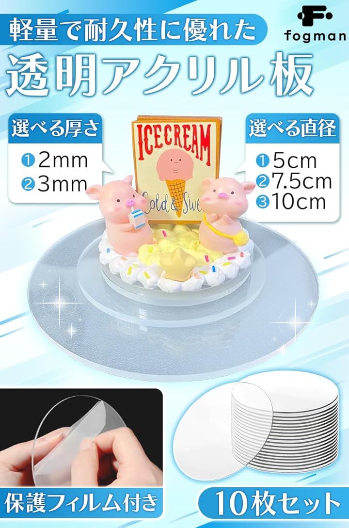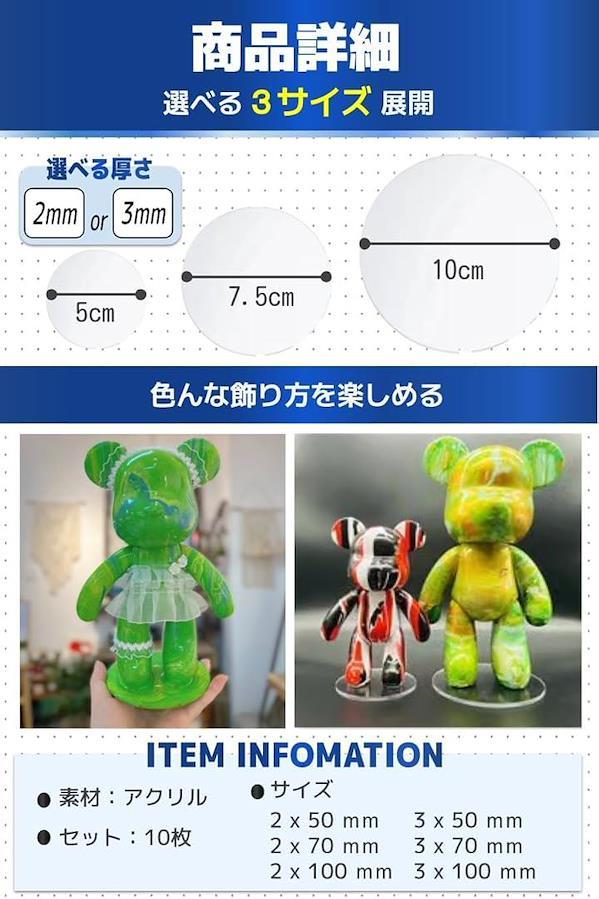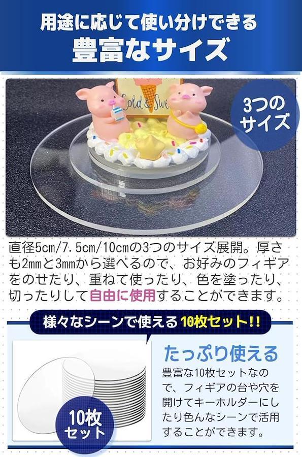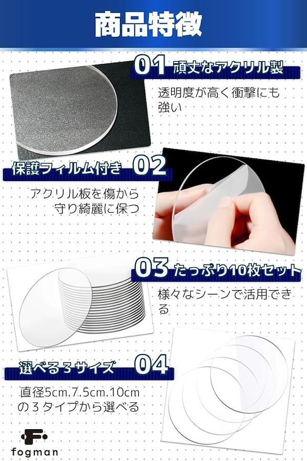 「商品特徴」(1)頑丈なアクリル製:透明度が高く衝撃にも強い/(2)保護フィルム付き:アクリル板を傷から守り綺麗に保つ/(3)たっぷり10枚セット:様々なシーンで活用できる/(4)選べる3サイズ:直径5cm.7.5cm.10cmの3タイプから選べる「商品詳細」素材:アクリルセット:10枚/サイズ:2 x 50 mm/2 x 70 mm/2 x 100 mm/3 x 50 mm/3 x 70 mm/3 x 100 mm//