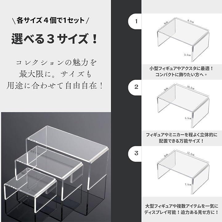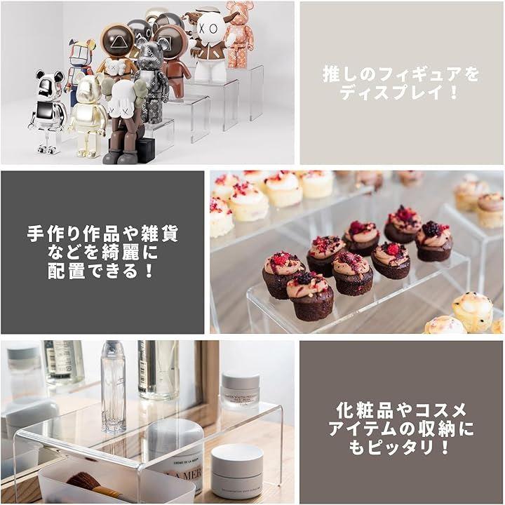 材質:透明アクリル 厚さ:2mm 耐荷重:500g未満推奨 特徴:コの字型、自由な配置、クリアタイプ 4個セット 用途:商品展示、コレクション陳列、棚の仕切り、撮影小物 お手入れ:水洗い可能、再利用時は乾燥推奨 注意事項:保護フィルムを剥がしてから使用してください