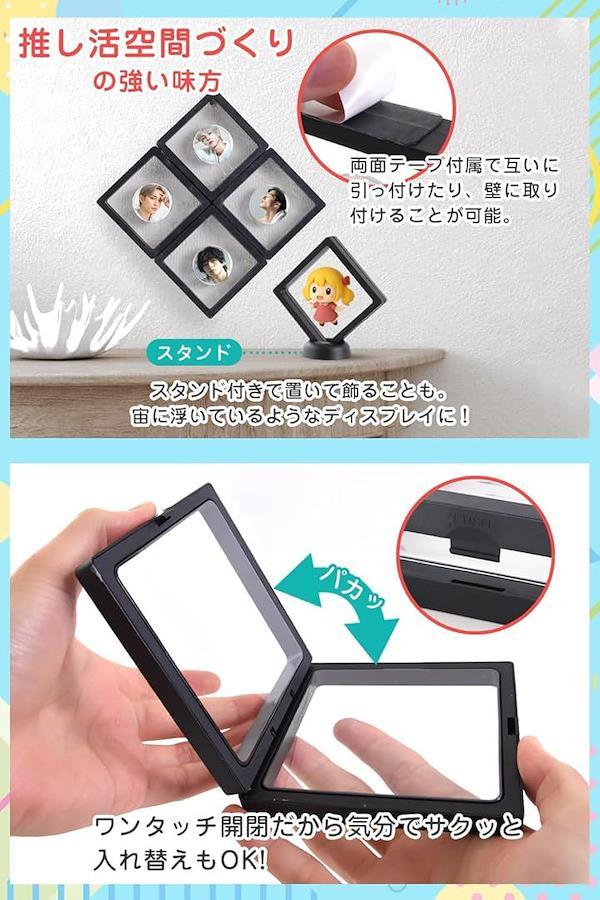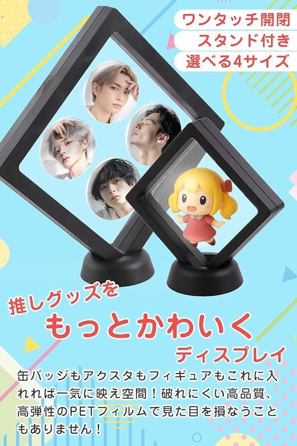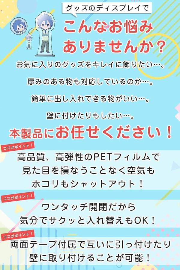 「推しグッズをもっとかわいくディスプレイ。」缶バッジもアクスタもフィギュアもこれに入れれば一気に映え空間。破れにくい高品質、高弾性のPETフィルムで見た目を損なうこともありません。そのまま飾っても壁に貼ってもかわいい、推し活空間づくりの強い味方です。