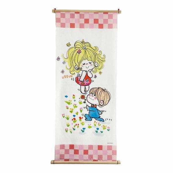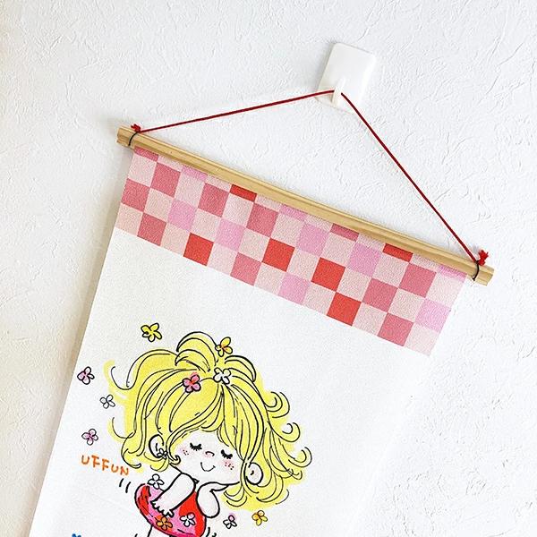 水森亜土のイラストが描かれたちりめん生地のタペストリーです。和テイストかわいいインテリアアイテムで、亜土ちゃんの世界観をお家でも楽しんでくださいね♪