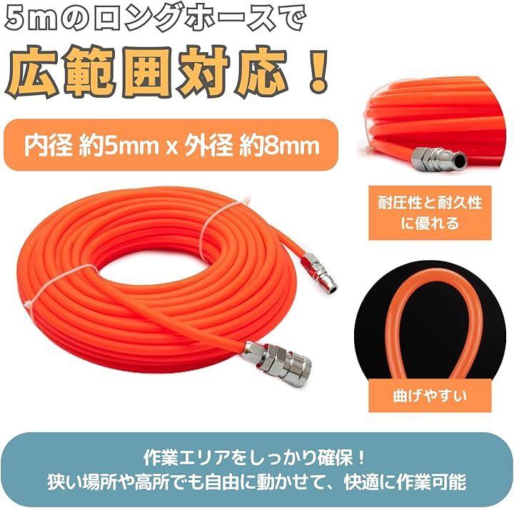 「広範囲で使えるエアホース」 作業エリアを広く確保でき、工場やガレージ、自宅でのDIY作業にも最適。
