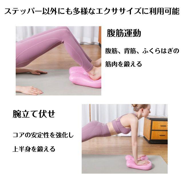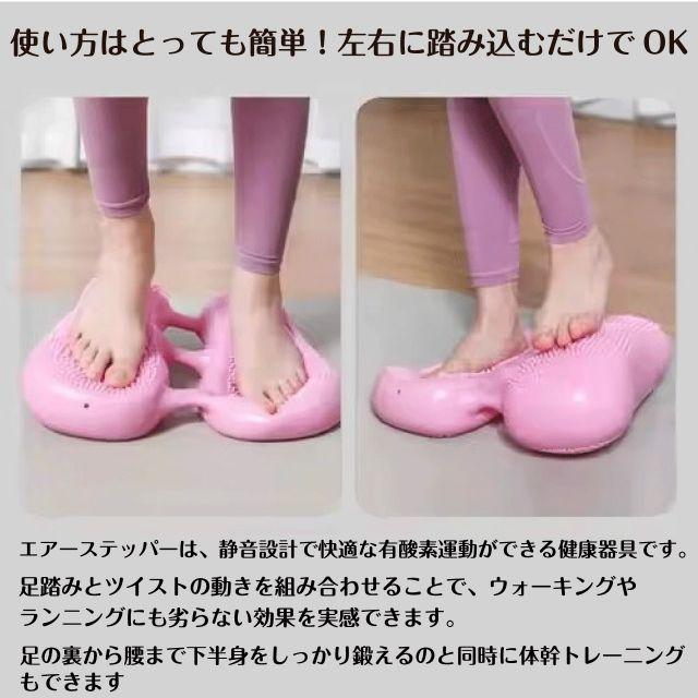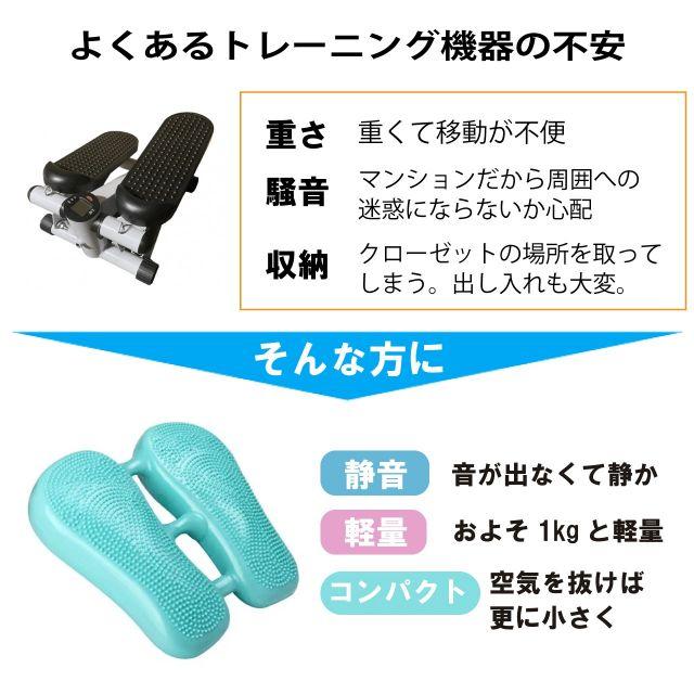 左右に踏み込むだけで下半身をしっかり鍛えるのと同時に、体幹トレーニングもできるエアステッパーです。音が出ないため、住宅環境を気にせず自宅で手軽にトレーニングができます!ステッパー以外にも、腹筋運動、腕立て伏せ、バランス運動、スクワットなど多様なエクササイズに利用可能◎両面設計なので、表側は高強度、裏面は低強度のマッサージと使い分けができます。よくあるトレーニング機器のような騒音、重さ、収納が不便という問題もなく、自宅で音を気にせずいつでもお使い頂けます!空気を抜けば更に小さく、出し入れも楽々、コンパクトに収納できます♪