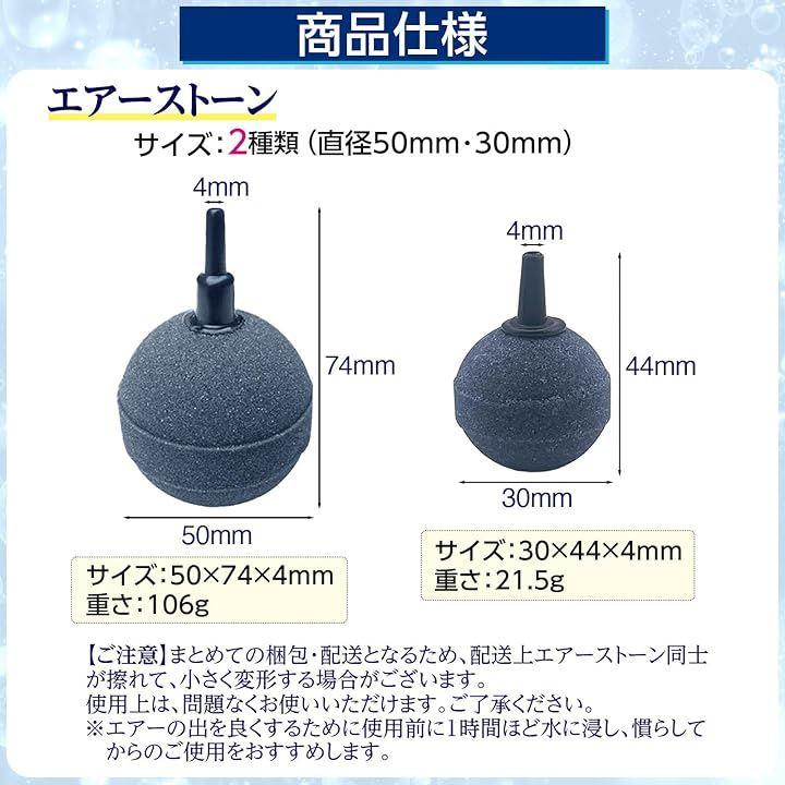 「特徴」水槽用エアーストーンは、細かい泡を均一に放出し、飼育水の酸素供給を促進。
