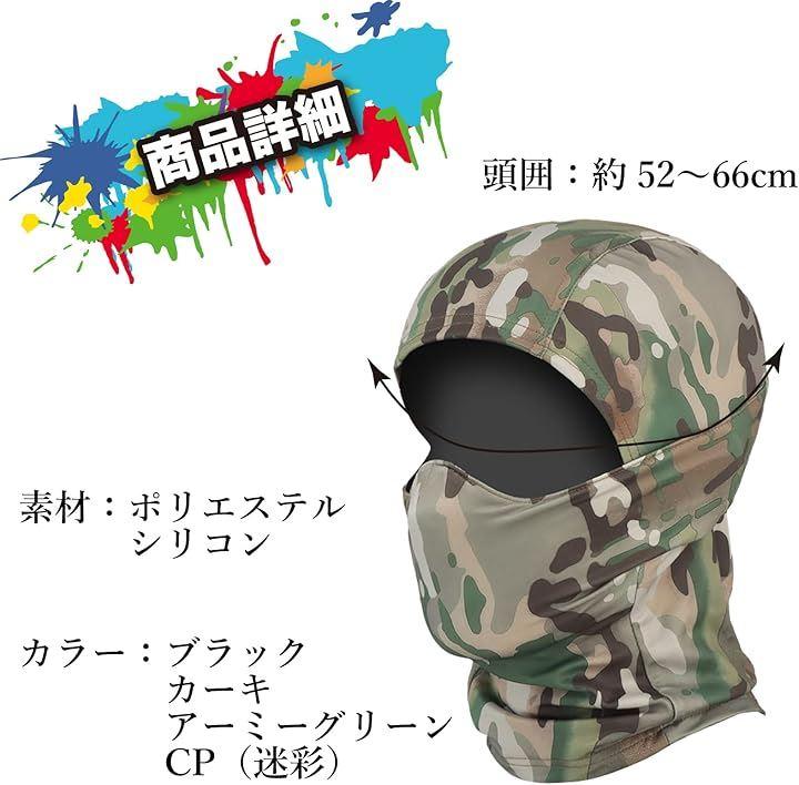 「商品詳細」セット内容:サバゲー用フェイスカバー カラー:ブラック、カーキ、アーミーグリーン、CP(迷彩) サイズ:頭囲約52~66cm 材質:ポリエステル、シリコン