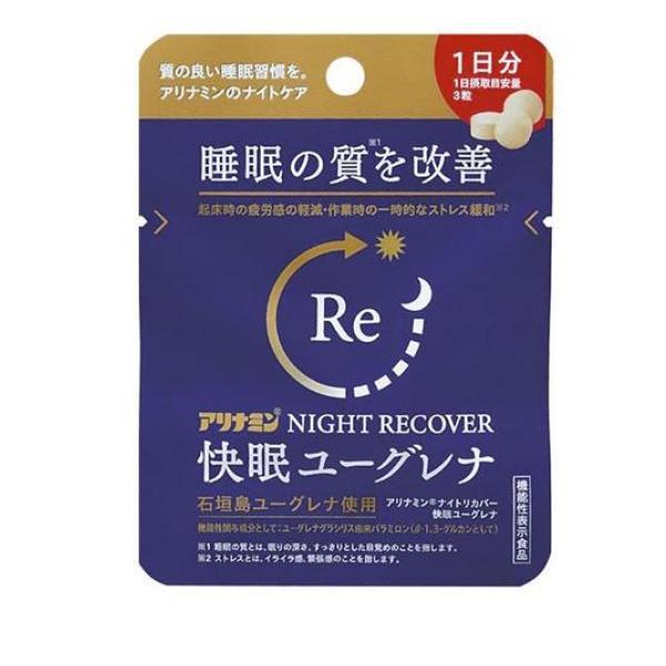 製品の特徴●アリナミン NIGHT RECOVER ナイトリカバー 快眠ユーグレナ●サプリメント●深い眠り、スッキリとした目覚めといった睡眠の質(*1)を改善する機能が報告されているユーグレナグラシリス由来パラミロン(*2)を配合。[*1:睡眠の質とは、眠りの深さ、すっきりとした目覚めのことを指します。][*2:パラミロン(β1,3-グルカンとして)とは、ユーグレナのみが生成する多糖類で、食物繊維の一種です。]●朝までぐっすり寝て、翌朝元気に活動したい、そんな方にオススメです。●名称:ユーグレナグラシリス加工食品●機能性表示食品