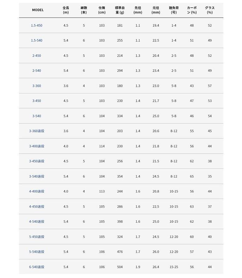 全長:3.6m継数:4本/仕舞:104cm自重:203g錘負荷:8-12号