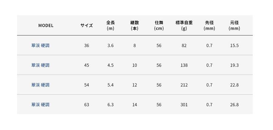 全長5.4m継数12本仕舞56cm自重212g先径0.7mm元径22.8mm