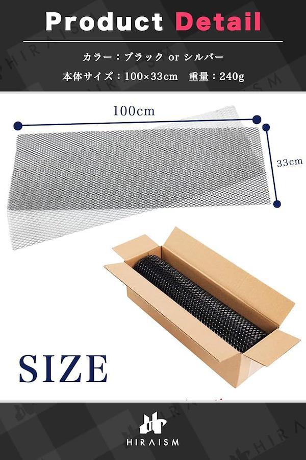 「商品内容」フロントグリル用アルミメッシュ カラー:ブラック 網目サイズ: 8x16mm 本体サイズ:100x33cm 重量:240g