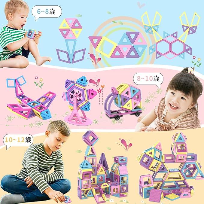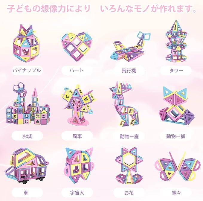 ■商品説明【172pcs人気の知育玩具】キャッスル マグネットブロックはマカロン色を採用され、女の子を問わずに男の子にも大人気のブロックセットです。弊社の の磁石ブロックには、磁気ブロック102個 、他の車輪・観覧車・パネルパーツ70PCSを含まれています。26pcsの正方形、26pcsの三角形、6pcsの半円形、12pcsの長三角、4pcsの長方形、2pcsの拱?パーツ、2pcsの六角形、三方形*2pcs、五角形*2pcs 、ひし形 *4pcs、台形*4pcs、扇子形*4pcs、小矩形* 8pcs、観覧車パーツの8pcs、2pcsの車輪 36pcsのパネルパーツ。いろいろな形のパーツを含めて、お得なマグネットおもちゃセットです。ご注意:マグネットおもちゃ、ブロックパーツはランダム配色になっております。 【安全・安心・高品質材質】安心して使ってもらえる理由は?おもちゃ安全基準合格製品。CE承認、CPC(Children's Product Certificate)EN-71,ASTM,HR4040認定済みマグネットおもちゃ。本磁気ブロックおもちゃは日本製高品質のABS素材+天然磁石で作られており、プラスチック各辺の中央には強磁性のマグネットが内蔵されています。長時間経っても、磁力が弱くなりなく、有害物も発散しない知育おもちゃマグネット ブロックです。 【自由で切り替え、能力を向上する玩具】3歳からの子供が磁気ブロックを利用して、2D-3D構築を作りながら、子供たちが色と形が認識できます、創造力が刺激できます、磁石の基本原理が理解できることによって、科学に対して興味を持てるようになります、DIYしながら、さまざまなアイデアを思い出し、異なる造型を作れます。ピースが多ければ多いほど、より多くの造形を作ることができます。キャッスル、動物、飛行機、車、観覧車、ロケット、遊園地設備などマニュアルの形を真似るだけでなく、自分でさまざまな形を作ることもできます。 【子供へプレゼントにもおすすめ】楽しく遊びながら学ぶことができるため、お子様の成長を自然に促すことができます。男の子、女の子を問わずに、お子さまやお孫さまへのお誕生日プレゼントや、帰省されたお孫さんへのプレゼント、出産祝い、子供の日、お誕生日イベント時、クリスマス、ご褒美にも、プレゼントとしてご利用いただけます。思っていたより小さいサイズで、室内でもアウトドアでも簡単に楽しく遊べます。プレゼントにもピッタリ! 【保護者の方へご注意ください】この商品には小さな磁石が含まれています。磁石を飲み込んでしまった場合、腸全体に粘着し、重度の感染症や死亡を引き起こします。磁石を飲み込んだり、吸い込んだりした場合は、 すぐに医師の診察を受けてください。ご注意:ブロックの色はランダムです、形と数を参考してください。色が気になる方は慎重に選んでください。?もっと見る
