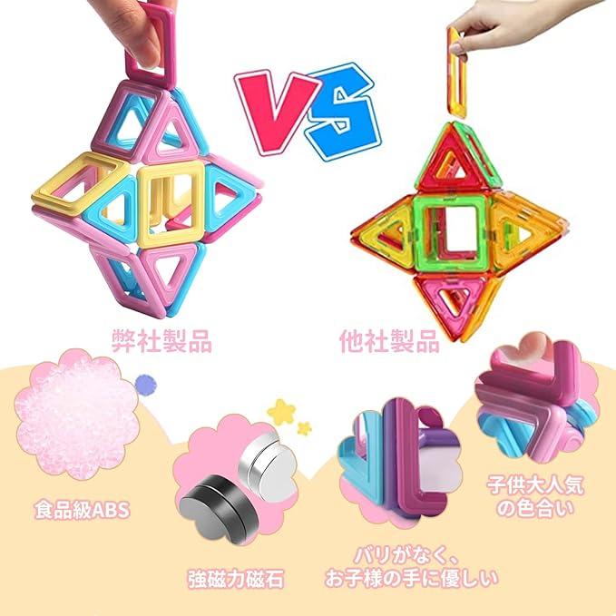 この商品について 【172pcs人気の知育玩具】キャッスル マグネットブロックはマカロン色を採用され、女の子を問わずに男の子にも大人気のブロックセットです。弊社の の磁石ブロックには、磁気ブロック102個 、他の車輪・観覧車・パネルパーツ70PCSを含まれています。26pcsの正方形、26pcsの三角形、6pcsの半円形、12pcsの長三角、4pcsの長方形、2pcsの拱?パーツ、2pcsの六角形、三方形*2pcs、五角形*2pcs 、ひし形 *4pcs、台形*4pcs、扇子形*4pcs、小矩形* 8pcs、観覧車パーツの8pcs、2pcsの車輪 36pcsのパネルパーツ。いろいろな形のパーツを含めて、お得なマグネットおもちゃセットです。ご注意:マグネットおもちゃ、ブロックパーツはランダム配色になっております。 【安全・安心・高品質材質】安心して使ってもらえる理由は?おもちゃ安全基準合格製品。CE承認、CPC(Children's Product Certificate)EN-71,ASTM,HR4040認定済みマグネットおもちゃ。本磁気ブロックおもちゃは日本製高品質のABS素材+天然磁石で作られており、プラスチック各辺の中央には強磁性のマグネットが内蔵されています。長時間経っても、磁力が弱くなりなく、有害物も発散しない知育おもちゃマグネット ブロックです。 【自由で切り替え、能力を向上する玩具】3歳からの子供が磁気ブロックを利用して、2D-3D構築を作りながら、子供たちが色と形が認識できます、創造力が刺激できます、磁石の基本原理が理解できることによって、科学に対して興味を持てるようになります、DIYしながら、さまざまなアイデアを思い出し、異なる造型を作れます。ピースが多ければ多いほど、より多くの造形を作ることができます。キャッスル、動物、飛行機、車、観覧車、ロケット、遊園地設備などマニュアルの形を真似るだけでなく、自分でさまざまな形を作ることもできます。 【子供へプレゼントにもおすすめ】楽しく遊びながら学ぶことができるため、お子様の成長を自然に促すことができます。男の子、女の子を問わずに、お子さまやお孫さまへのお誕生日プレゼントや、帰省されたお孫さんへのプレゼント、出産祝い、子供の日、お誕生日イベント時、クリスマス、ご褒美にも、プレゼントとしてご利用いただけます。思っていたより小さいサイズで、室内でもアウトドアでも簡単に楽しく遊べます。プレゼントにもピッタリ! 【保護者の方へご注意ください】この商品には小さな磁石が含まれています。磁石を飲み込んでしまった場合、腸全体に粘着し、重度の感染症や死亡を引き起こします。磁石を飲み込んだり、吸い込んだりした場合は、 すぐに医師の診察を受けてください。ご注意:ブロックの色はランダムです、形と数を参考してください。色が気になる方は慎重に選んでください。もっと見る