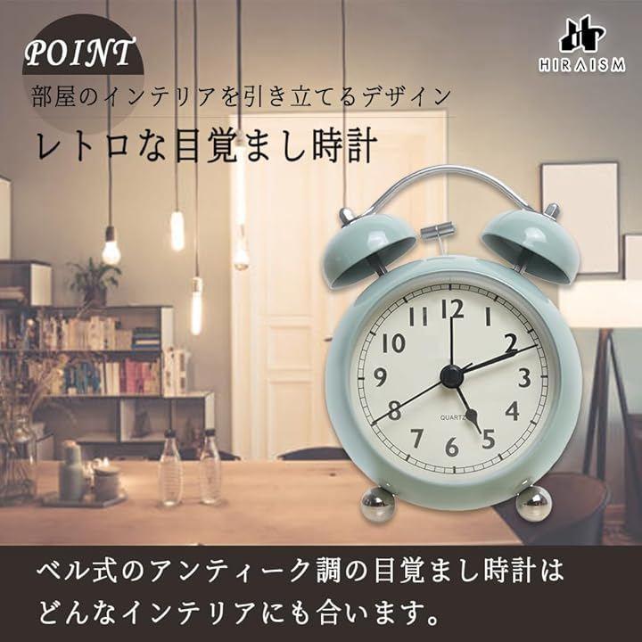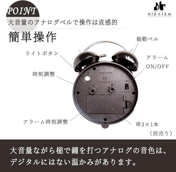 クラシックなベル式タイプの目覚まし時計で、大音量ながら槌で鐘を打つ音色はデジタルにはない温かみを持っています。