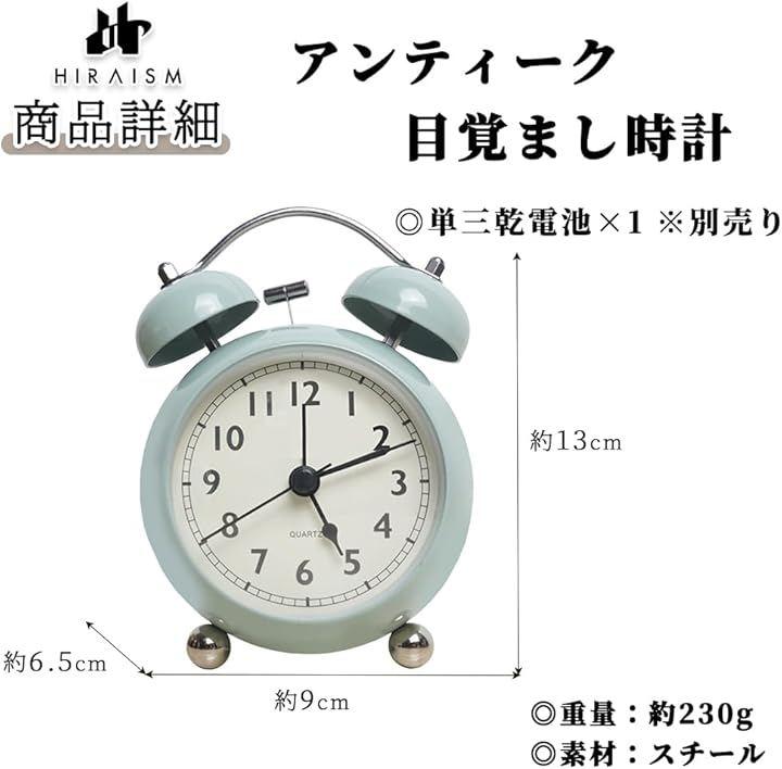 「商品内容」アンティーク目覚まし時計 直径9cmx奥行6.5cmx高さ13cm 230g 単3型電池1本(別売)