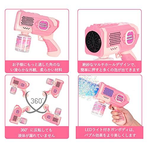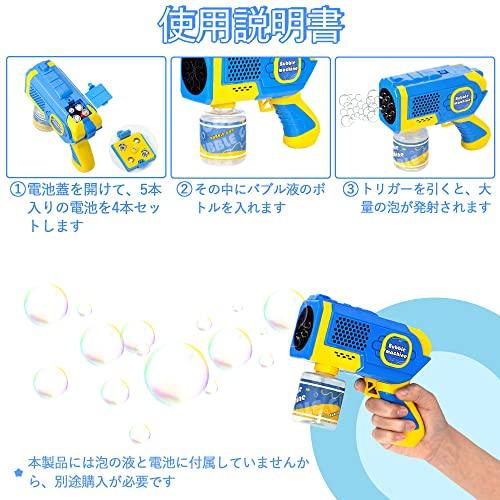 これはお子様のおもちゃとしてだけでなく、パーティーや野外イベントでのパフォーマンスのツールとしてもお使いいただけます。全自動の連続式発泡機、長持ちパワー、360度液漏れ防止で、お子様がもっと楽しく遊べます。8つのバブルホールがありますから、一度に多くのバブルを発射できて、銃のLEDライトはまばゆい光があります。お子様が楽しく遊べます。 バブルマシンのサイズは16.5×13.5×6cm、重さは218gと、お子様が遊ぶのに適したコンパクトなサイズです。 8つのバブルホールがありますから、一度に多くのバブルを発射できて、銃のLEDライトはまばゆい光があります。お子様が楽しく遊べます。これはお子様のおもちゃとしてだけでなく、パーティーや野外イベントでのパフォーマンスのツールとしてもお使いいただけます。 全自動の連続式発泡機、長持ちパワー、360度液漏れ防止で、お子様がもっと楽しく遊べます。 銃本体は、正極と負極に従って4本の単三電池を正しく入れる必要があります。このセットには、青いバブルガン本体とシャボン液ボトル、ピンクのバブルガン本体とシャボン液ボトルが含まれています。電池、シャボン玉液は付属していません(別途ご購入ください)。対象年齢:6歳以上。 高品質のABS材料で作られて、角がなく丸い外観です。耐久性があり、安全・無害で、安心して使用できます。