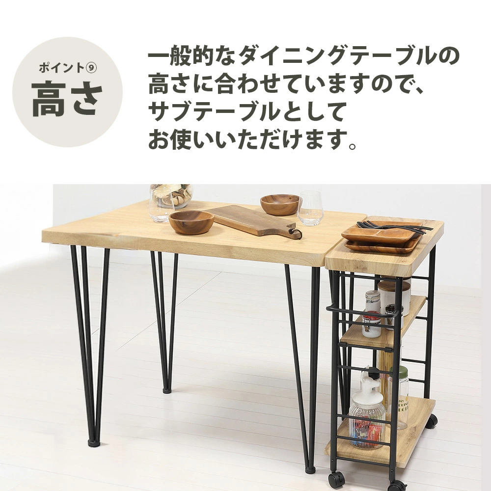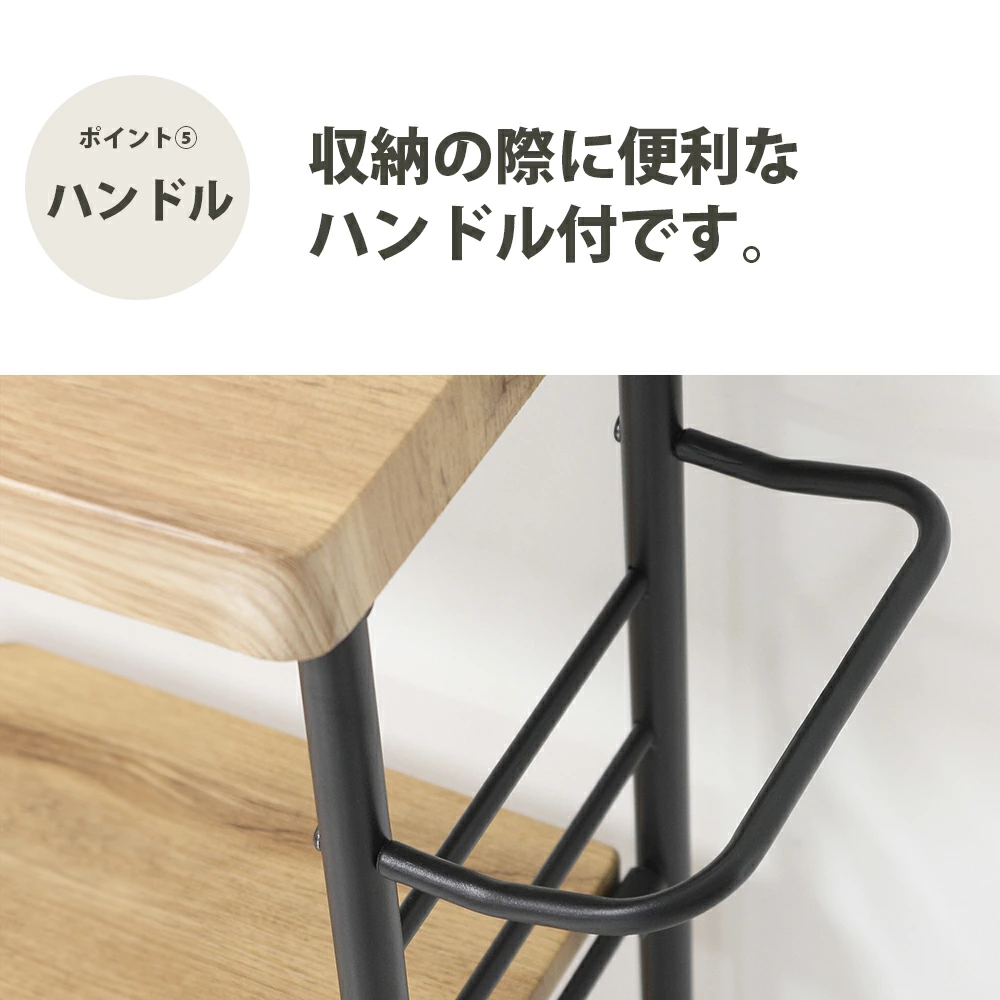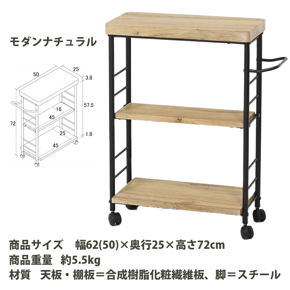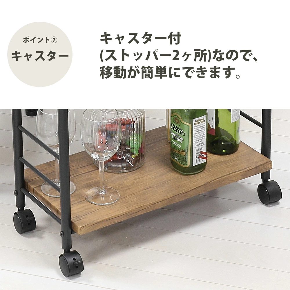 【商品情報】リビングやダイニングで活躍するスリムで場所をとらないワゴン。同じシリーズで合わせて使えば統一感のある空間が完成します。ポイント1 素材 天板・棚板は、凸凹のあるエンボス加工で高級感があり、合成樹脂ですので傷がつきにくく、お手入れが簡単です。ポイント2 板厚 天板は、厚さ約3.8cmと重厚感があります。棚板は、約1.8cm厚です。ポイント3 角丸 天板は、角を丸くしています。手触りもやさしく安全面にも配慮しました。ポイント4 可動棚 中央の棚板は可動式(5ヶ所)で、収納物に合わせて移動できます。ポイント5 ハンドル 収納の際に便利なハンドル付です。ポイント6 フレーム フレームはスチール製でスタイリッシュな印象、キッチン小物を引っ掛けることもできます。※フックは付属していません。ポイント7 キャスター キャスター付(ストッパー2ヶ所)なので、移動が簡単にできます。ポイント8 スリム 25cmとスリムなので、すきま収納としてもお使いいただけます。ポイント9 高さ 一般的なダイニングテーブルの高さに合わせていますので、サブテーブルとしてお使いいただけます。