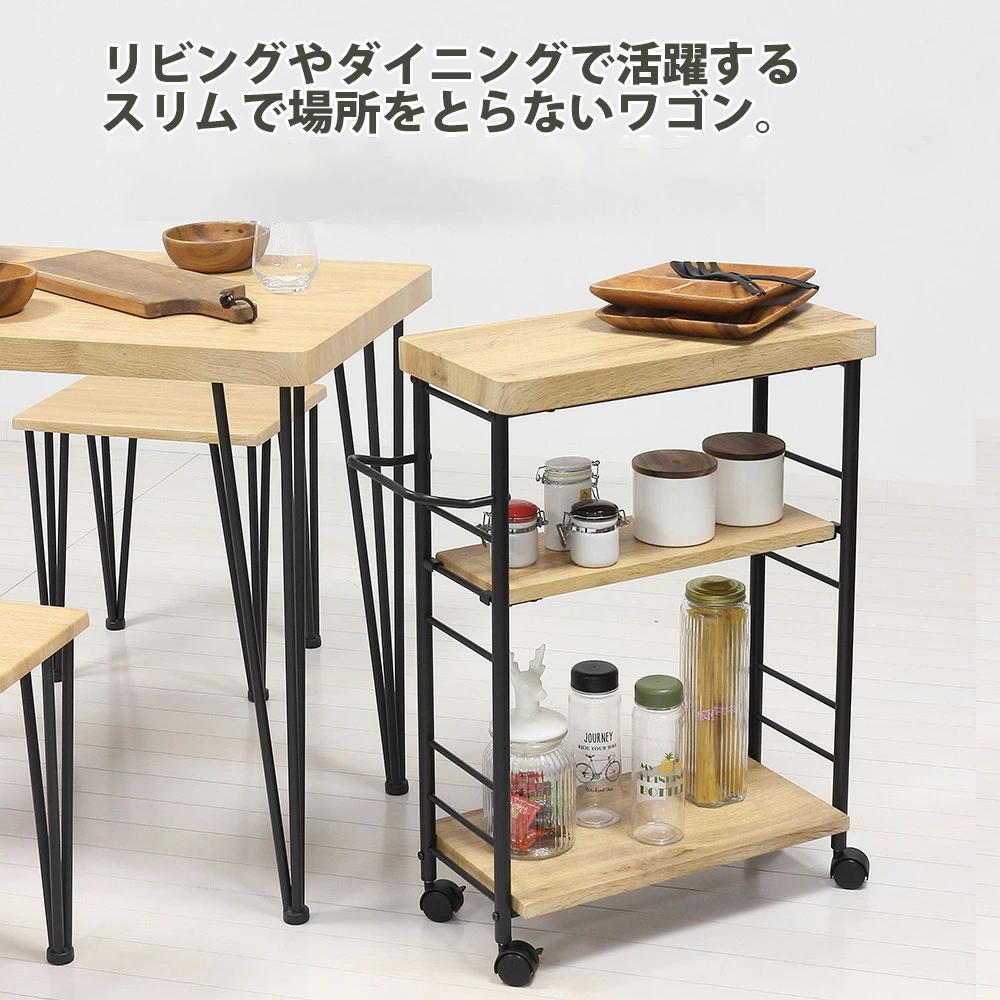 【商品情報】リビングやダイニングで活躍するスリムで場所をとらないワゴン。同じシリーズで合わせて使えば統一感のある空間が完成します。ポイント1 素材 天板・棚板は、凸凹のあるエンボス加工で高級感があり、合成樹脂ですので傷がつきにくく、お手入れが簡単です。ポイント2 板厚 天板は、厚さ約3.8cmと重厚感があります。棚板は、約1.8cm厚です。ポイント3 角丸 天板は、角を丸くしています。手触りもやさしく安全面にも配慮しました。ポイント4 可動棚 中央の棚板は可動式(5ヶ所)で、収納物に合わせて移動できます。ポイント5 ハンドル 収納の際に便利なハンドル付です。ポイント6 フレーム フレームはスチール製でスタイリッシュな印象、キッチン小物を引っ掛けることもできます。※フックは付属していません。ポイント7 キャスター キャスター付(ストッパー2ヶ所)なので、移動が簡単にできます。ポイント8 スリム 25cmとスリムなので、すきま収納としてもお使いいただけます。ポイント9 高さ 一般的なダイニングテーブルの高さに合わせていますので、サブテーブルとしてお使いいただけます。