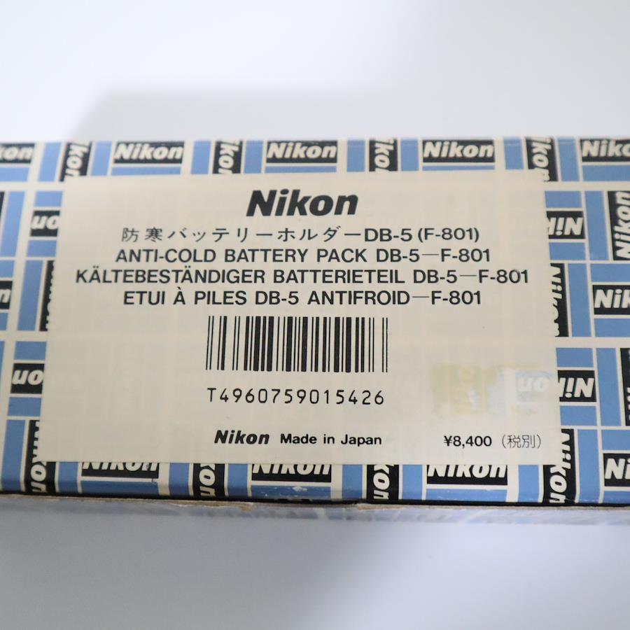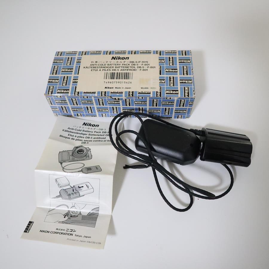 Nikon F-801/F-801S 用の純正アクセサリー「防寒バッテリーホルダー DB-5」です。現在では流通量が少なく、コレクション目的でも価値のあるアイテムです。箱・説明書付きで、状態も良好なため付属品を揃えたい方におすすめです。