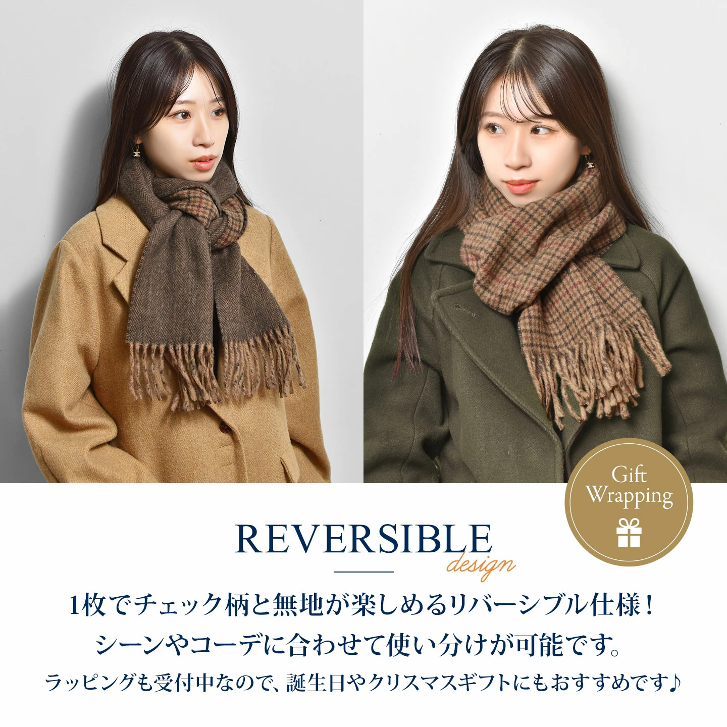 【REVERSIBLE WINDOWPANE SCARF】クラシックなウィンドウペイン柄で織り上げられ、ツイストロープフリンジとリバーシブルデザインが特徴のスカーフ。スタイリングの幅を広げてくれます。イタリア製で、ラグジュアリーとサステナビリティを融合させた一枚。刺繍入りのPPロゴが上品でタイムレスな印象を添えています。ユニセックスなのでお揃いにもぴったり。誕生日やクリスマスのプレゼントにもおすすめです。