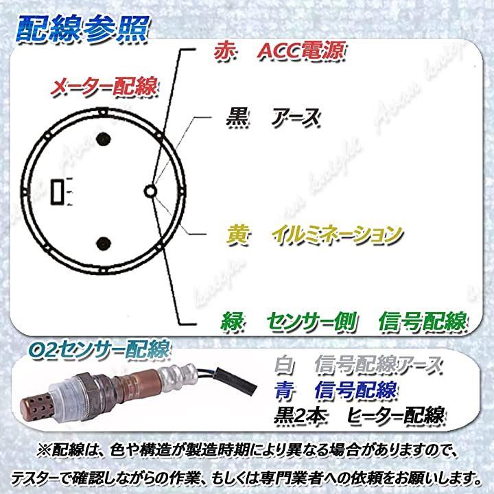 セット内容:空燃比計+O2センサー2点セットサイズ:高さ52mmx幅52mmx長さ52mm メーター配線:赤>ACC電源黒>アース黄>イルミネーション緑>センサー側信号配線 O2センサー配線:白>信号配線アース青>信号配線黒2本>ヒーター配線 配線に関しまして、色や構造は製造時期、入荷時期により異なりますので、テスター等で確認しながらの作業、もしくは専門業者へご依頼ください。