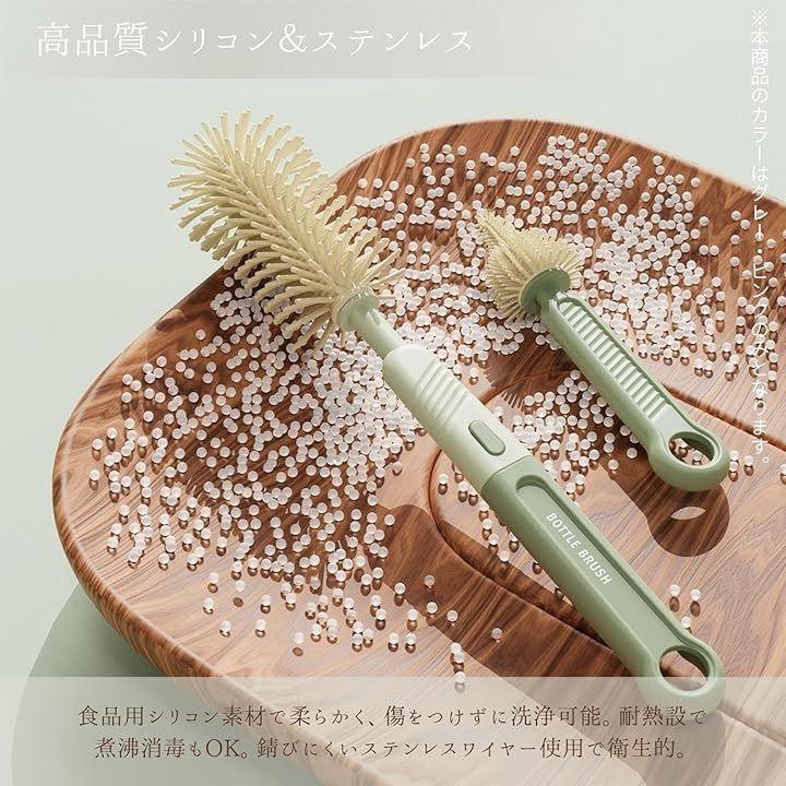 「コンパクト&持ち運び便利」・カラー:グレー/ピンク・付属品:哺乳瓶ブラシx1、乳首ブラシx1、瓶口ブラシx1、ストローブラシx1、乾燥棒x2、収納ケースx1