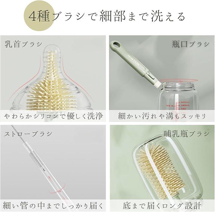「4種ブラシで細部まで洗える」・哺乳瓶ブラシ:底まで届くロング設計・乳首ブラシ:やわらかシリコンで優しく洗浄・瓶口ブラシ:細かい汚れや溝もスッキリ・ストローブラシ:細い管の中までしっかり届く