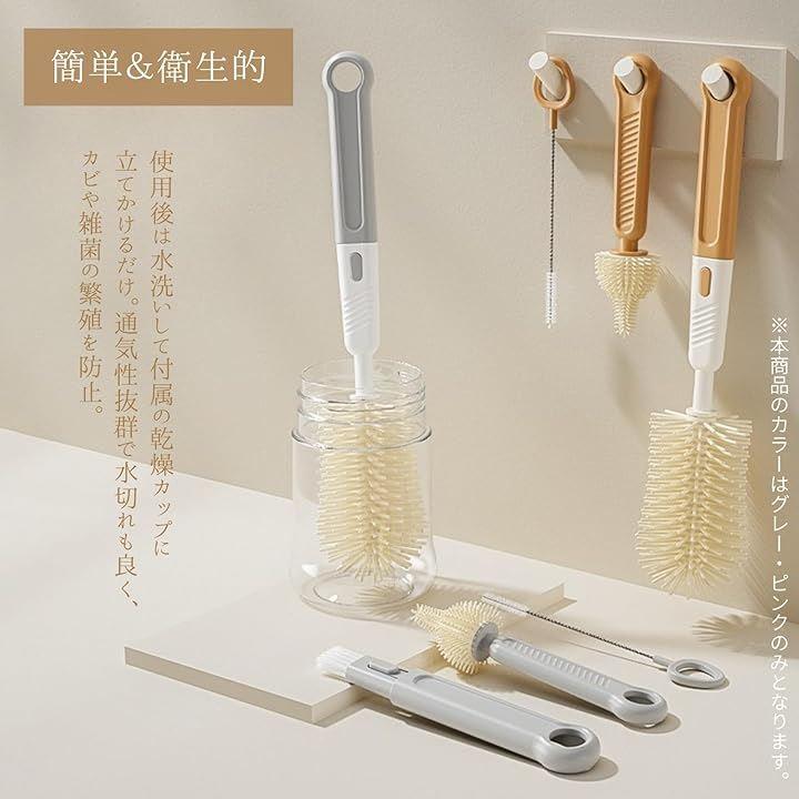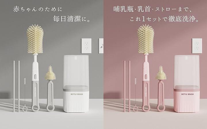 「赤ちゃんのために、毎日清潔に」哺乳瓶ブラシ、乳首ブラシ、瓶口ブラシ、ストローブラシ、乾燥棒x2、収納ケースが一式に。