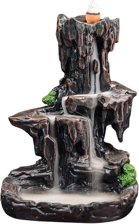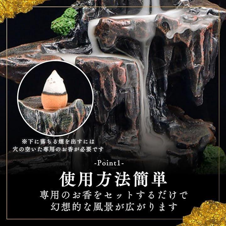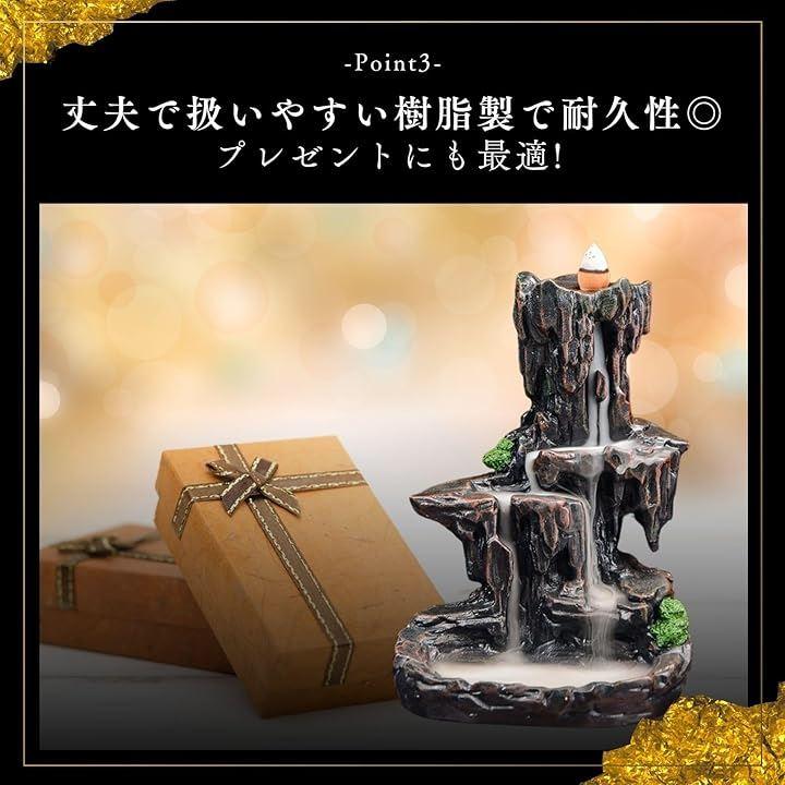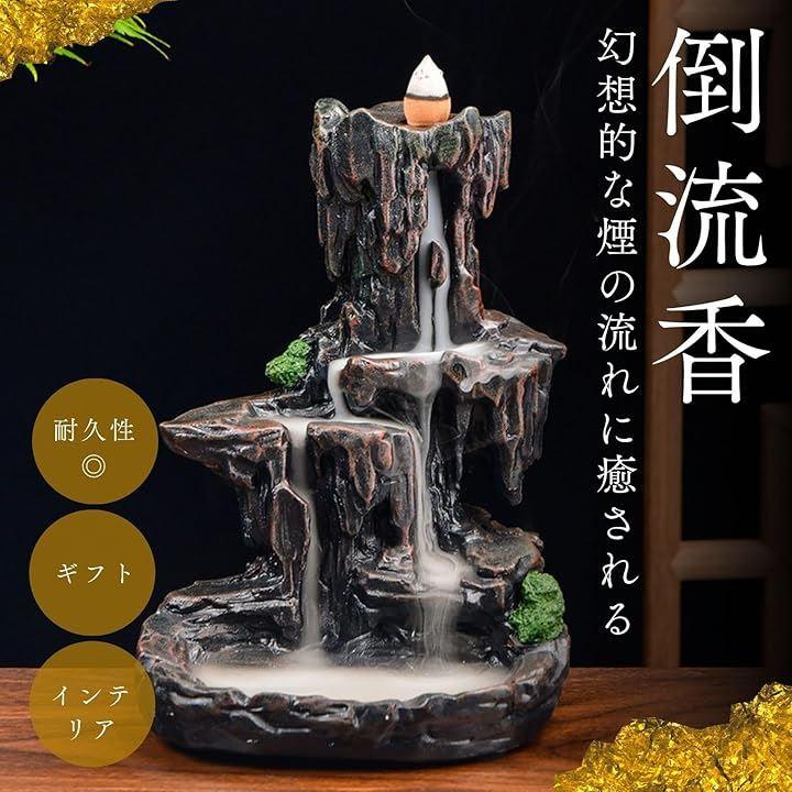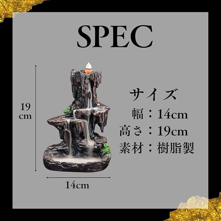 「商品仕様」サイズ:幅14cm x 高さ19cm 素材:丈夫な樹脂製 デザイン:滝をモチーフにした自然な岩肌デザイン 対応お香:倒流香(バックフローインセンス)専用 使用場所:リビング、寝室、オフィス、ヨガ・瞑想スペースなど