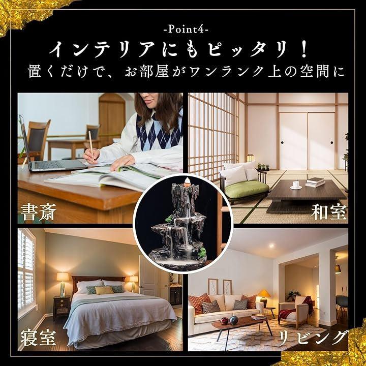 「リラックス効果抜群。アロマと視覚でダブルの癒し」倒流香のお香を使用することで、心を落ち着かせる香りが広がります。