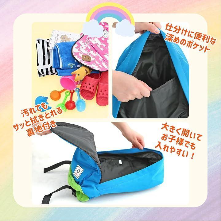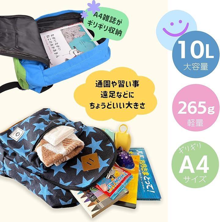 荷物の出し入れがしやすい様にダブルファスナーで大きく開くことができ、容量サイズはA4サイズの絵本も入る約10L程の容量。
