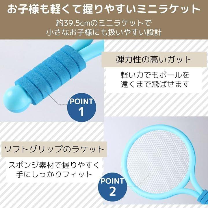 「お子様も安心。軽くて握りやすいミニラケット」約40cmのミニラケットは、小さなお子様にも扱いやすく、家族みんなで一緒に遊ぶのに最適です。