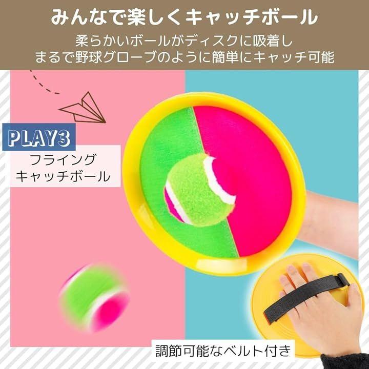 「みんなで楽しめるフライングキャッチボール」パネルラケットで、付属のくっ付くボールをキャッチして遊べる楽しさ。柔らかいボールがディスクに吸着し、まるで野球グローブのように簡単にキャッチ可能。