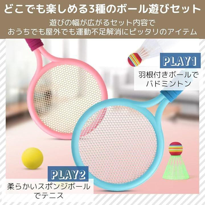 羽根付きボールでバドミントン、柔らかいスポンジボールでテニス、さらに面ファスナー付きキャッチボールで親子一緒にプレイ可能。