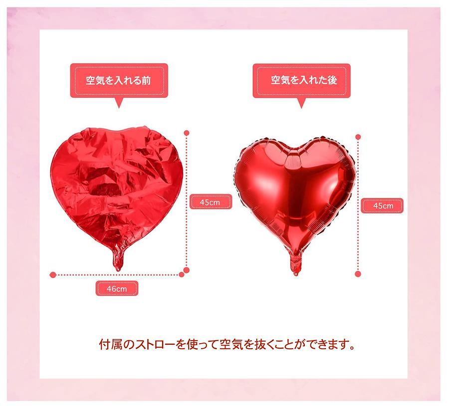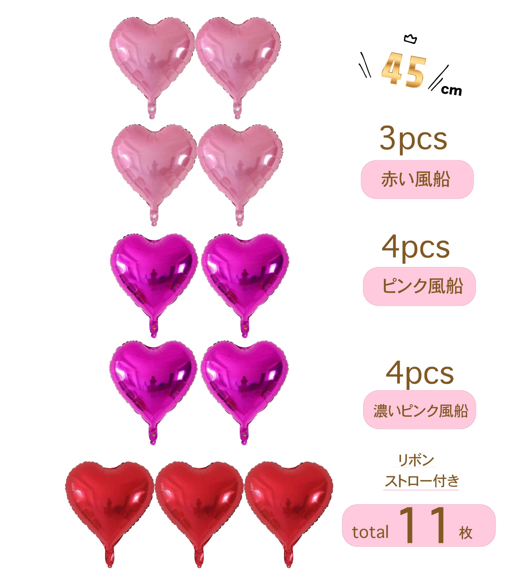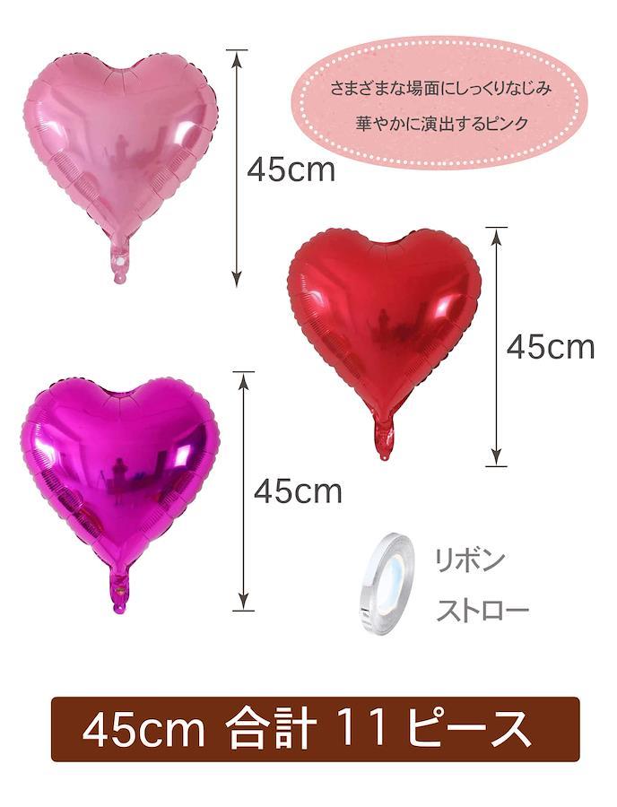 【仕様】形:ハート / ・サイズ:45cm /・数量:10+1個 ・色:ピンク×4、赤×3、パープルピンク×4 /・付属品:ストロー×1、リボン(ホワイト)×1【飾り・演出】単品でも、既存の飾りにプラスをしても◎雰囲気を華やがせるのに大活躍のハートのバルーン?大きなハートのアルミバルーンを10枚・20枚・30枚お好きな枚数をお選びいただけます。【アルミバルーン】ラテックスの風船と比べ丈夫で長持ちします。ヘリウムガスを入れると浮きます。お届け時は空気は入っていない状態で畳んでのお届けになります。ハンドポンプ、ヘリウムガスを使用して空気を入れてご利用ください。大きな風船のためストローではなくポンプ等の空気入れのご利用をおすすめいたします。(空気入れは付属しておりません)※空気を過度に入れすぎると破裂の原因になります。空気の入れ口が確保しにくい時はストローを少しずつ入り口に通してください。【こんな場面で】結婚式、結婚式の二次会、お返しのプレゼント、バレンタイン、誕生日、撮影、撮影会、記念写真、ハーフバースデー、ファーストバースデー、イベントなど様々な機会にご利用ください?【免責事項】メーカーによる商品リニューアルに伴いパッケージ(内容量も含む)変更が行われた場合、新パッケージでお届け致します事ご了承願います。